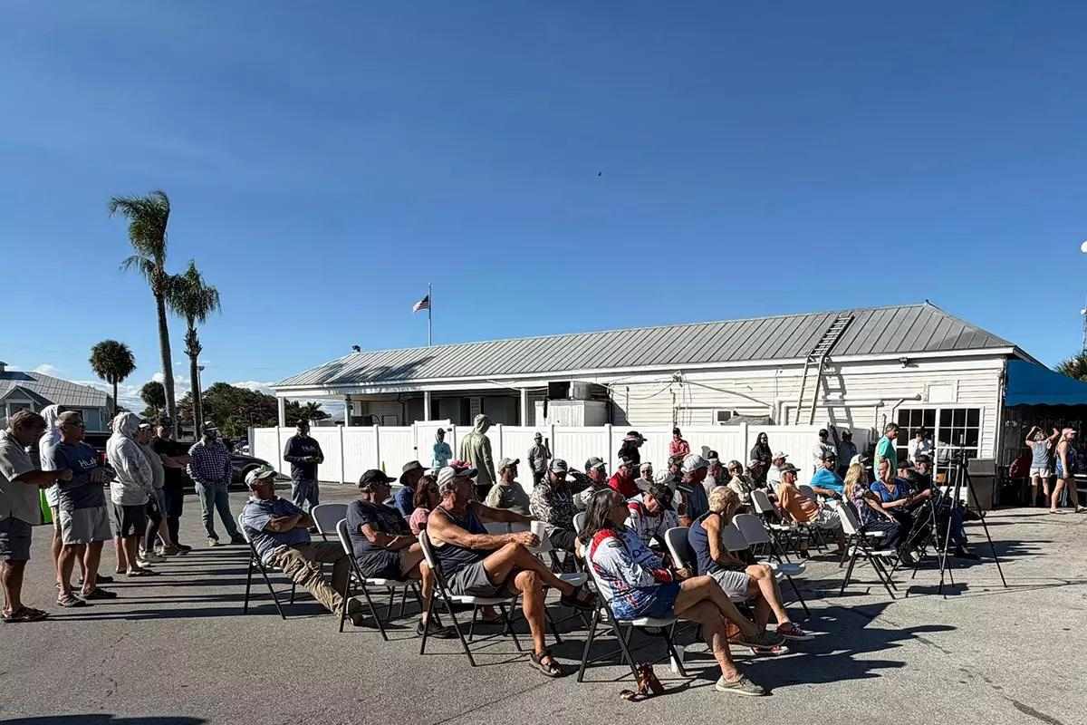 Anglers gather for the pre-tournament meeting prior to the first Dual Threat Fishing tournament at Lake Okeechobee in Clewiston, Fla., on January 23, 2026.